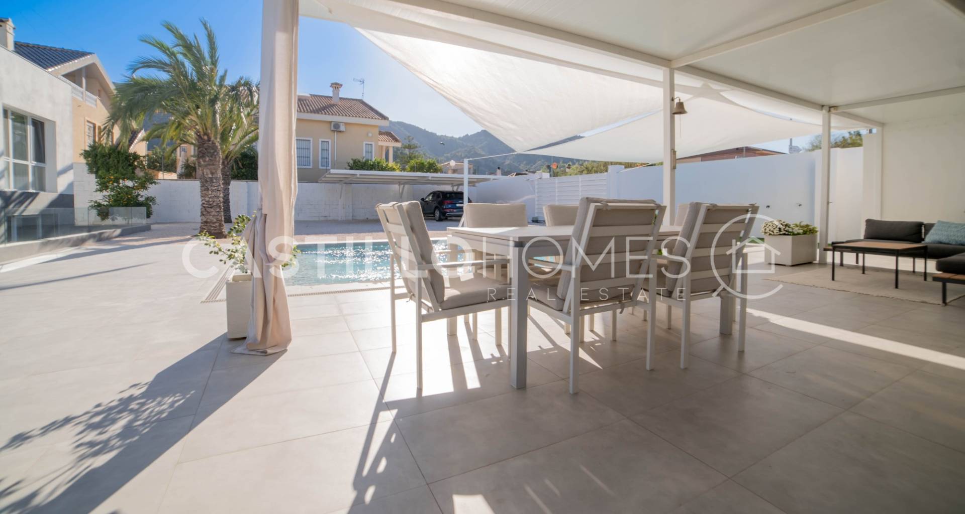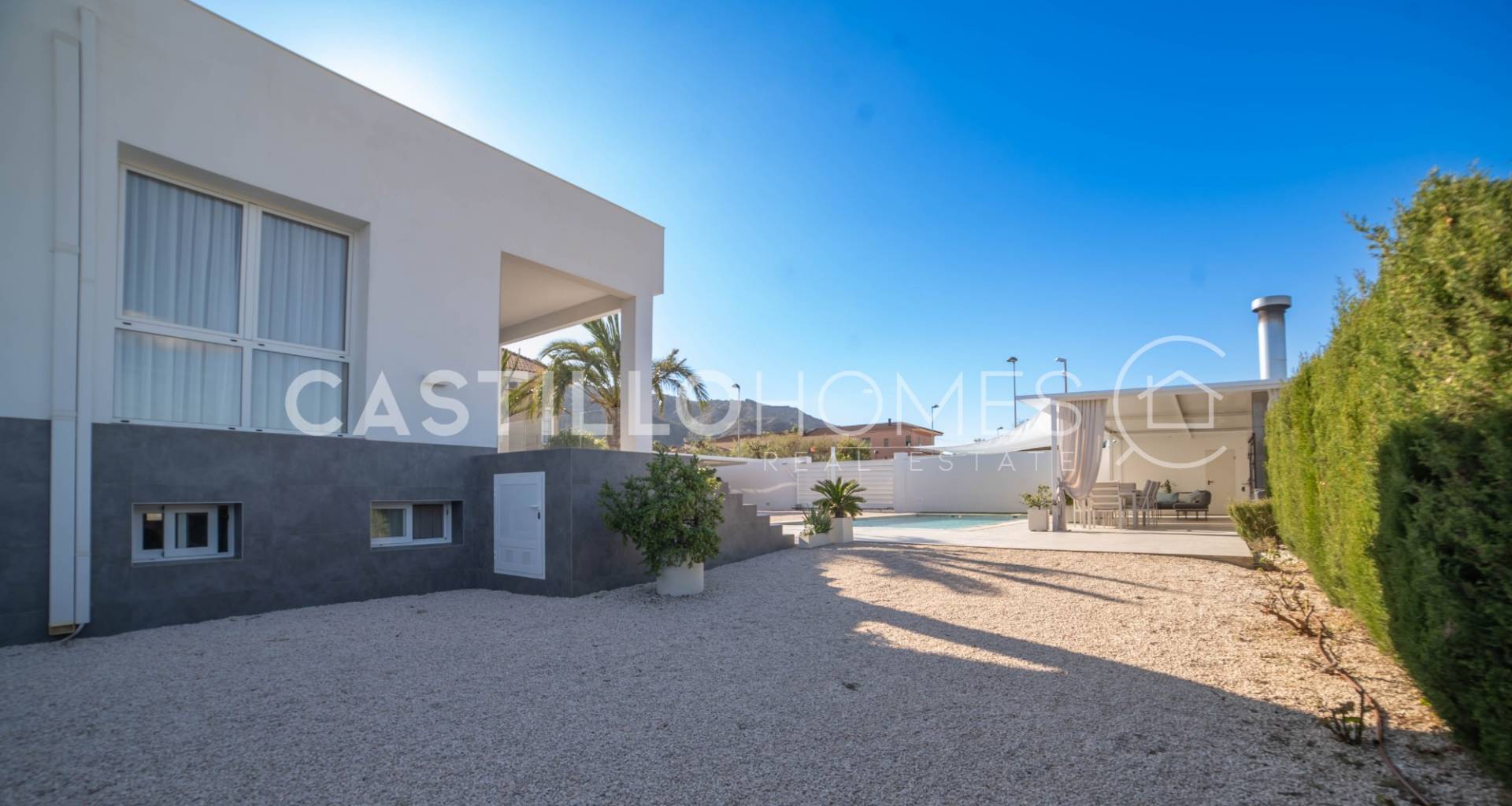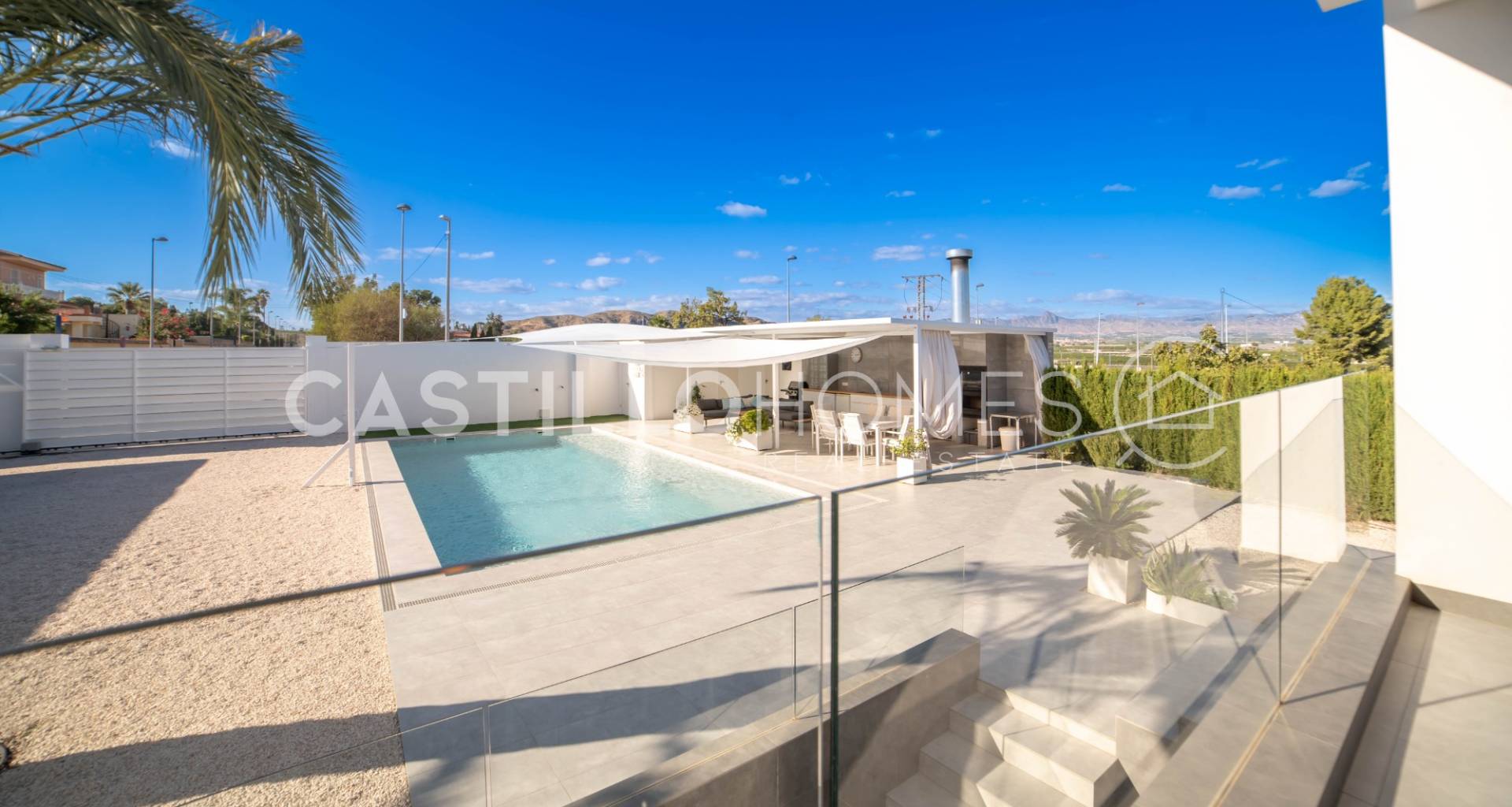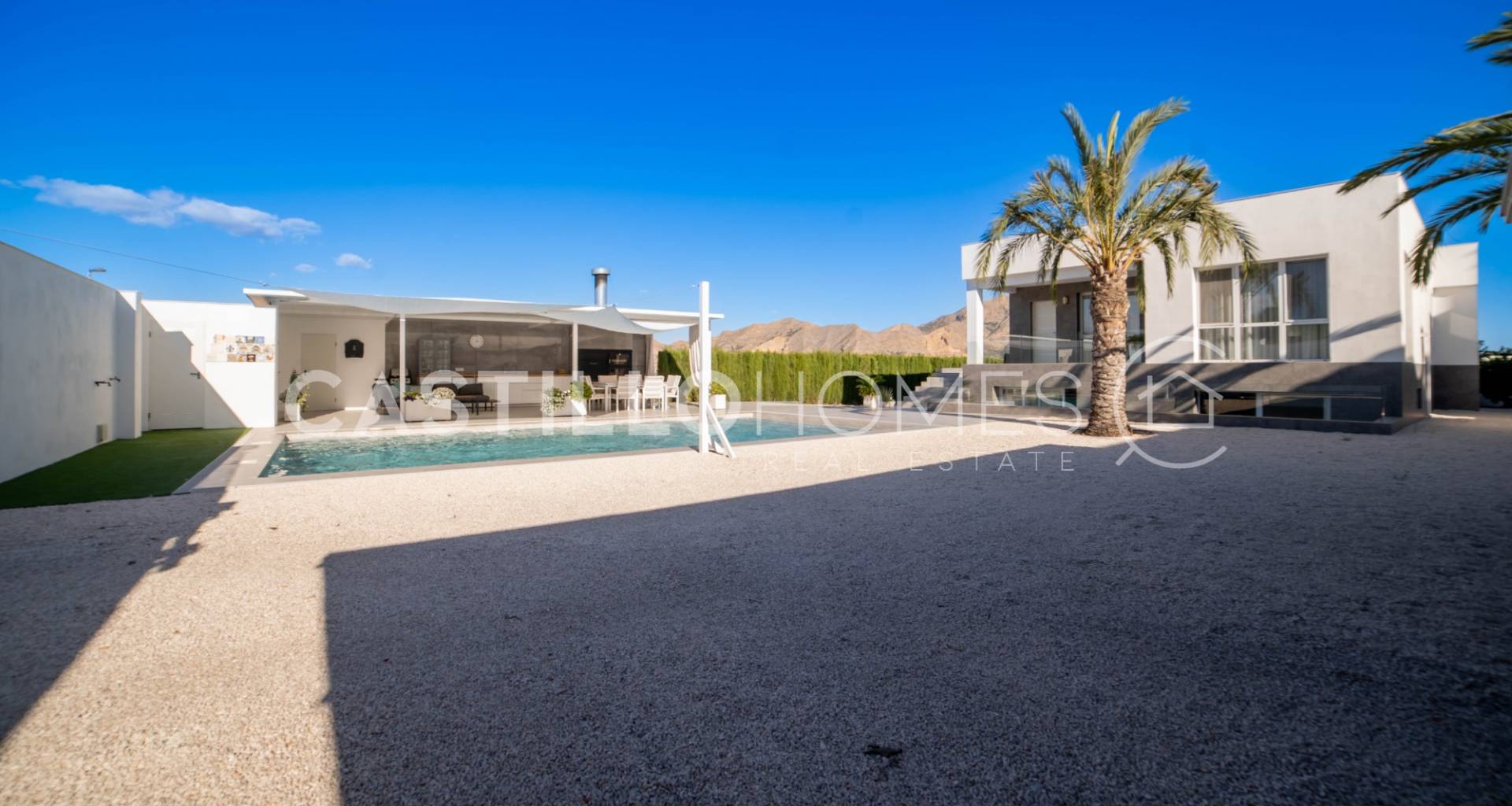 Modern villa med stor tomt, privat pool och fin utsikt över bergen