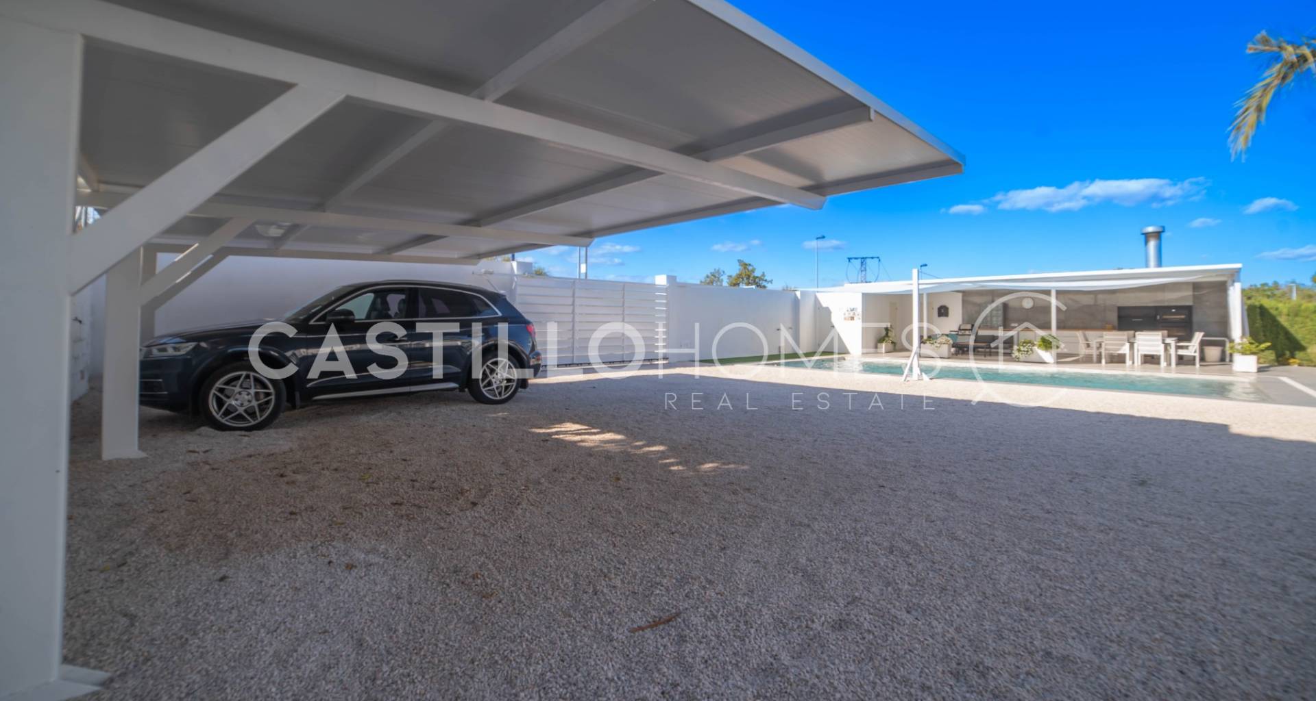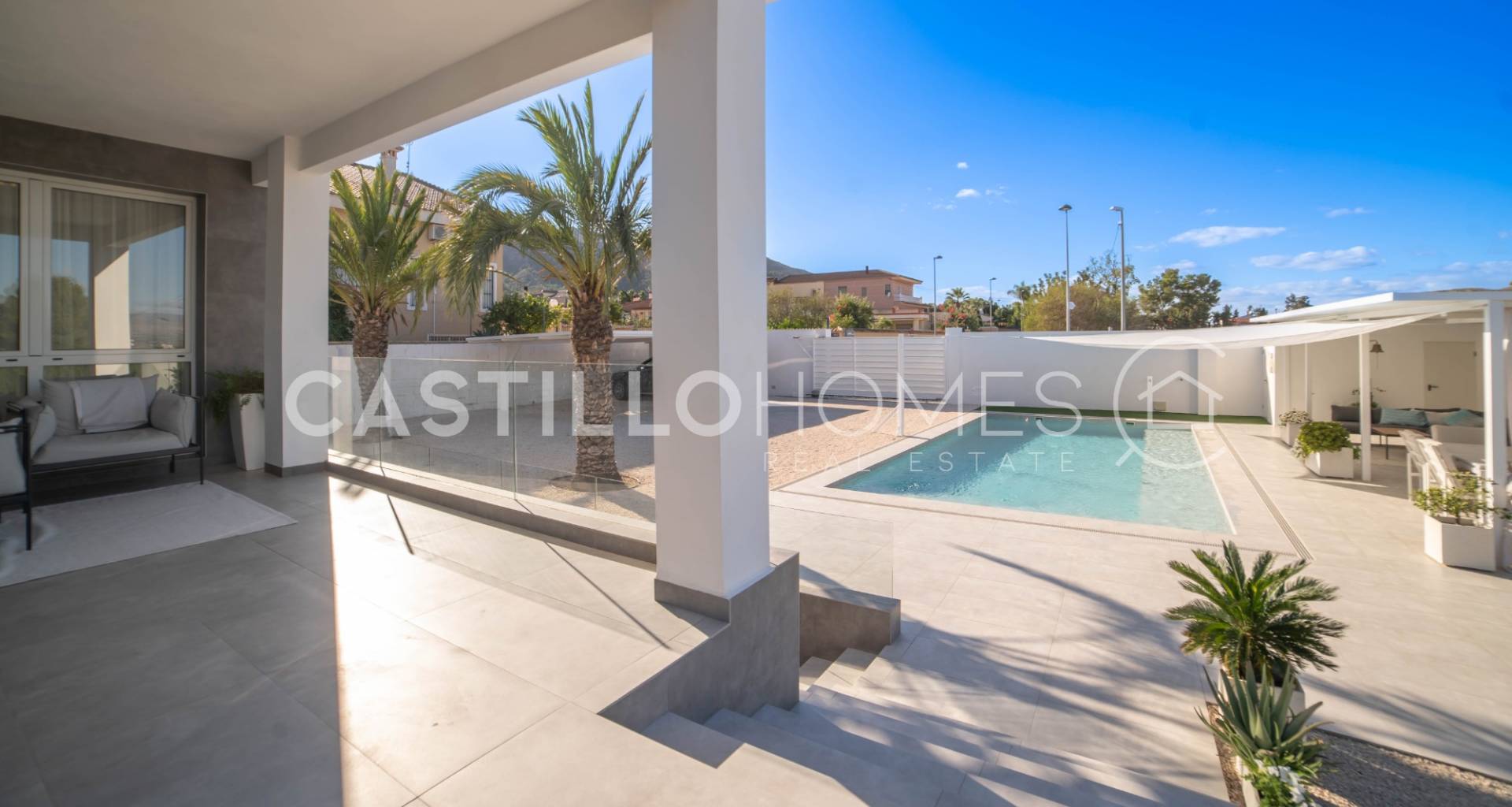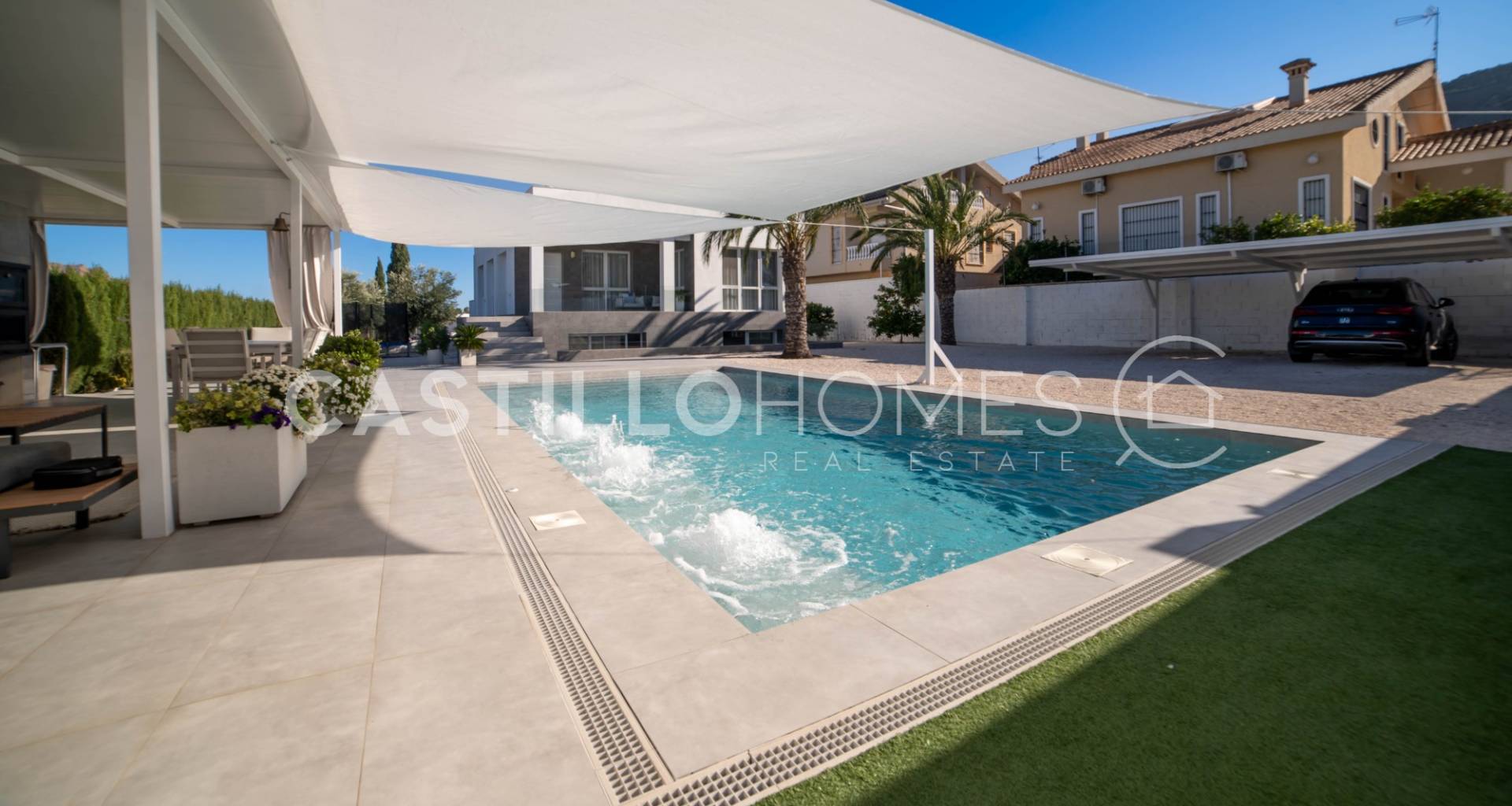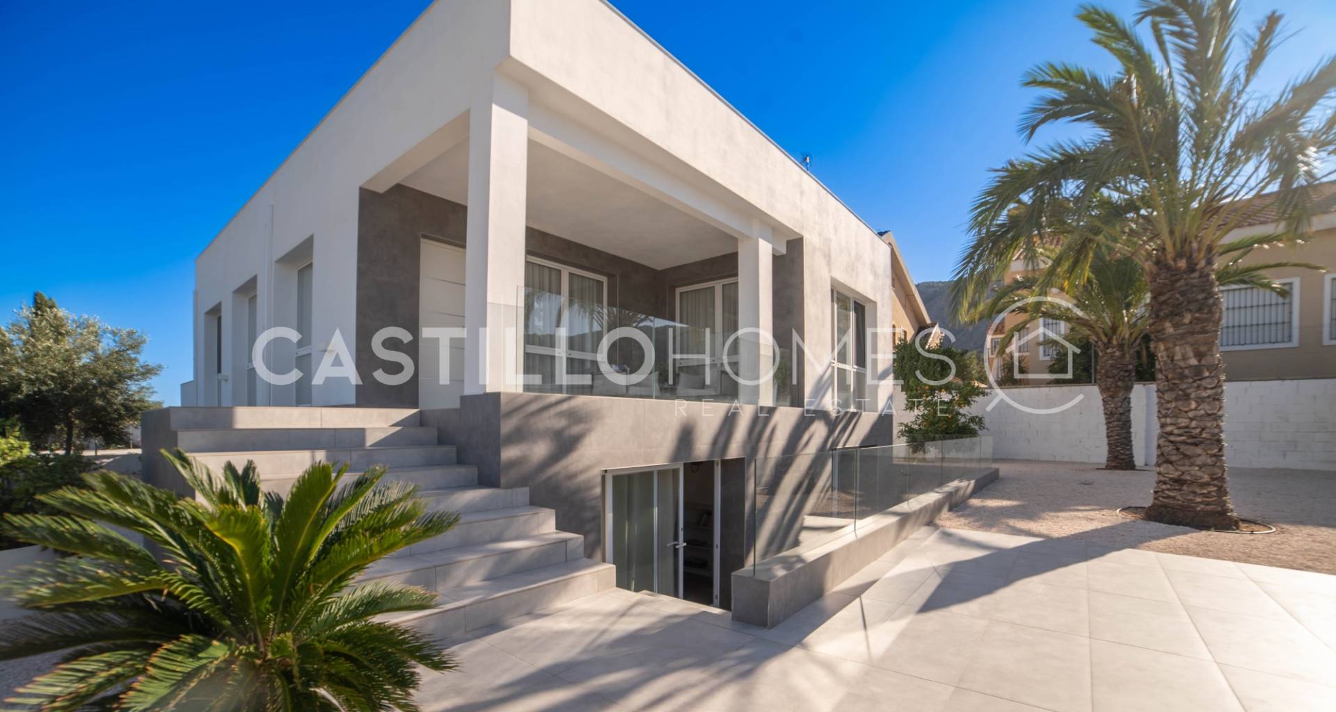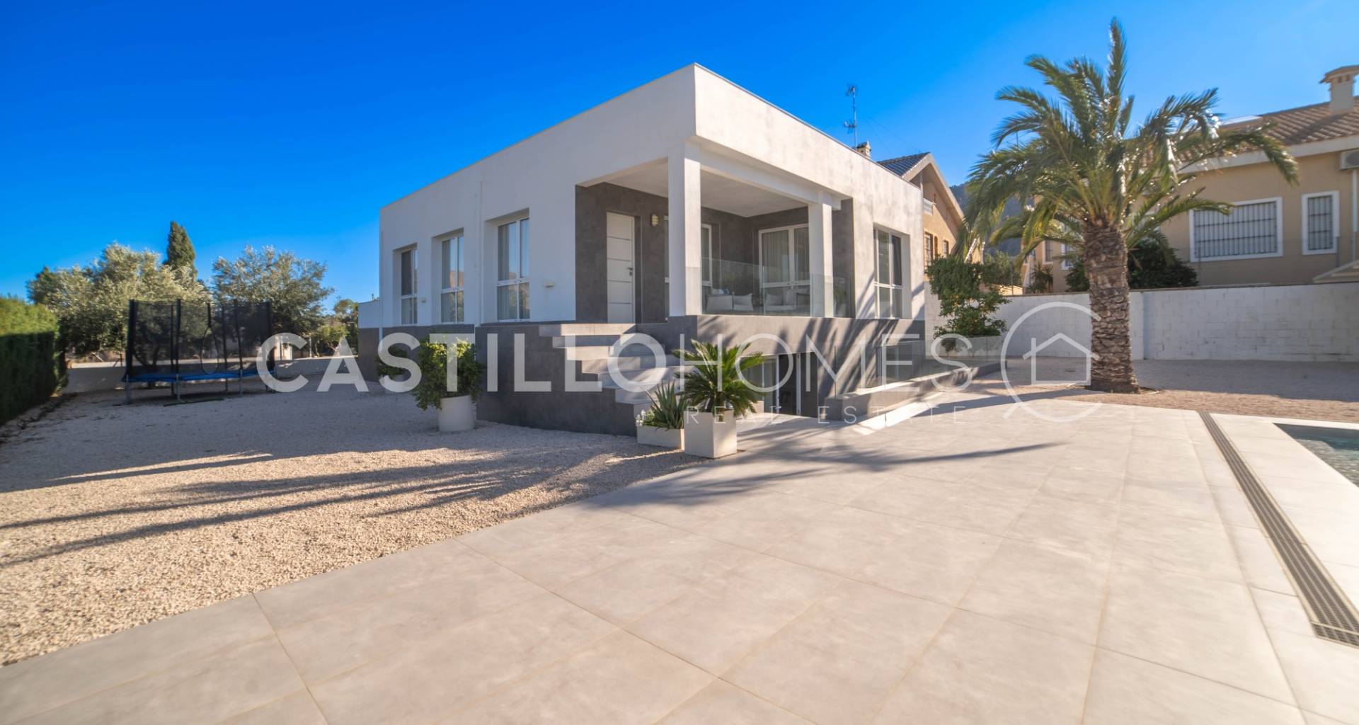 Modern villa med stor tomt, privat pool och fin utsikt över bergen